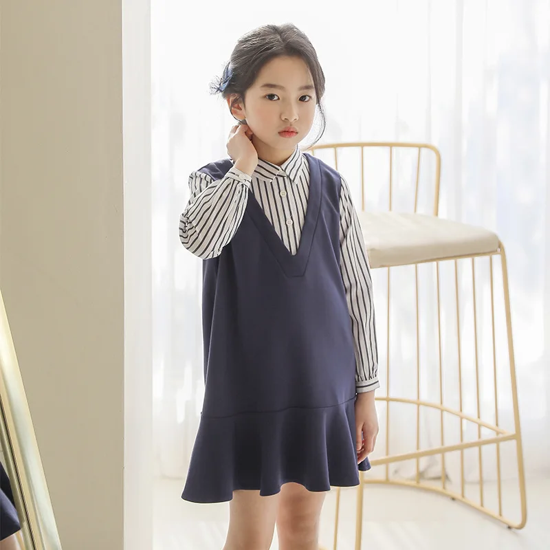 Осеннее платье для девочек, Синий Школьный костюм в полоску, платья для учащихся, Детская подростковая одежда в стиле преппи, платье с длинн...