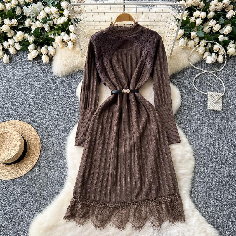 Осеннее французское ретро трикотажное элегантное длинное платье для женщин, новые ажурные кружевные винтажные платья, роскошное чувство тонкой талии, новинка 2024 года one-size кофейный