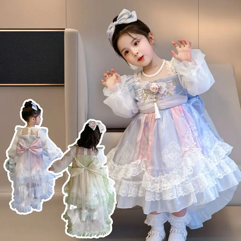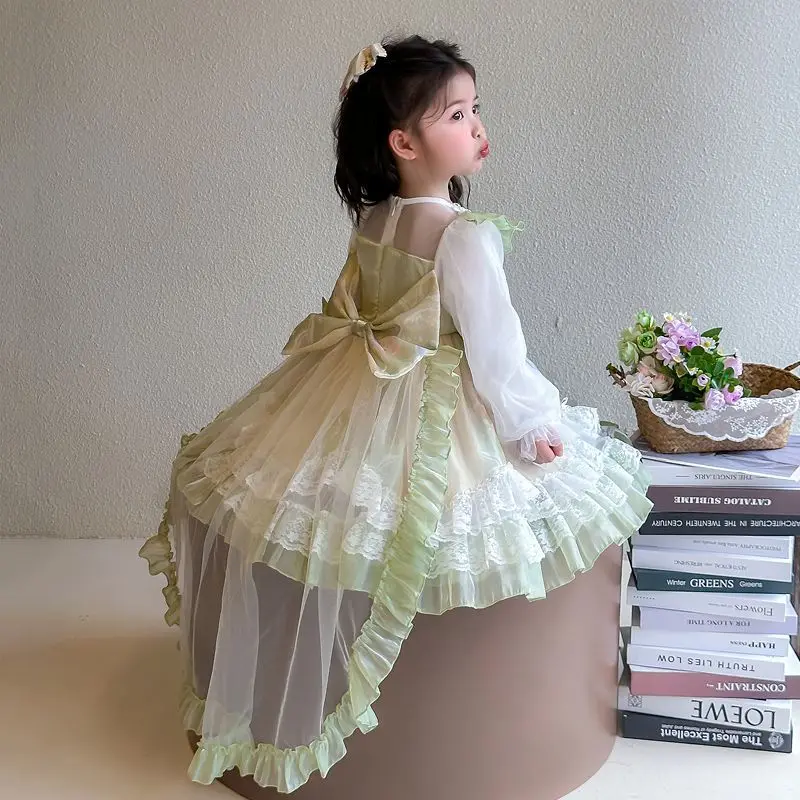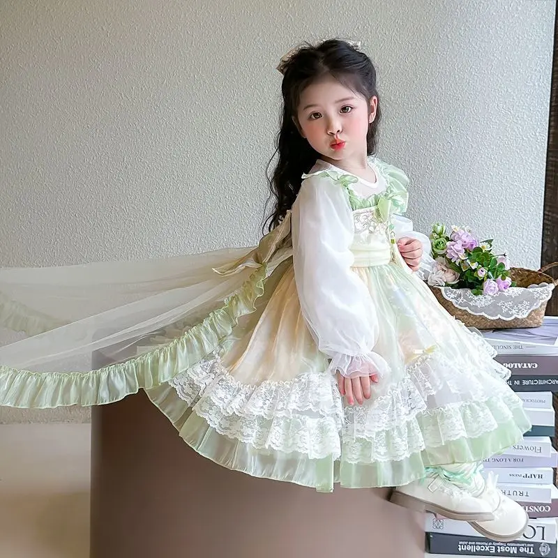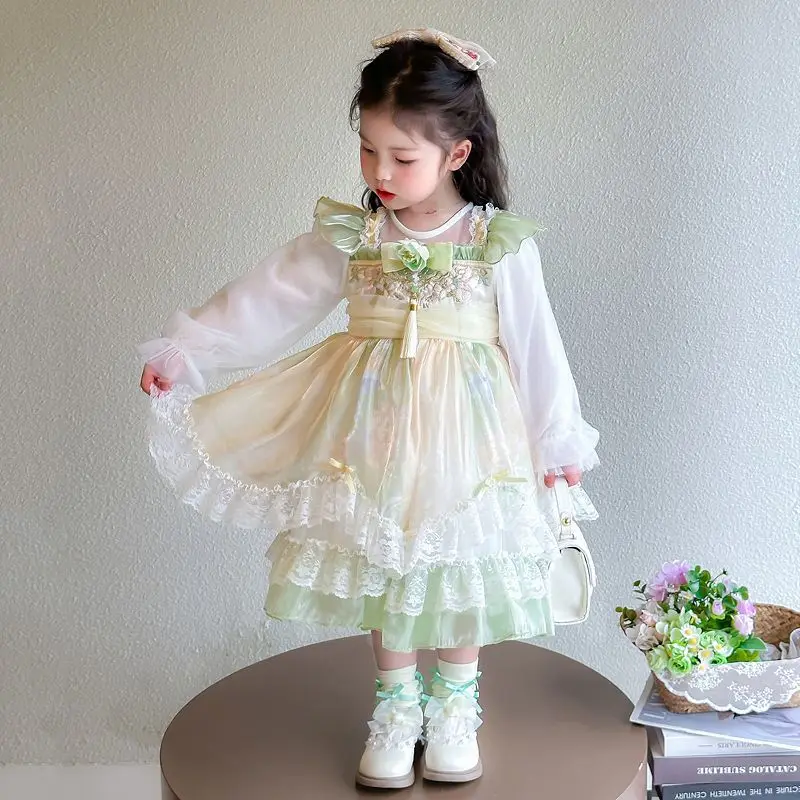 Осенне-весеннее винтажное многослойное кружевное бальное платье принцессы в стиле Лолиты с цветочным принтом для маленьких девочек, праздничное платье на день рождения, детская одежда для праздника и вечеринки