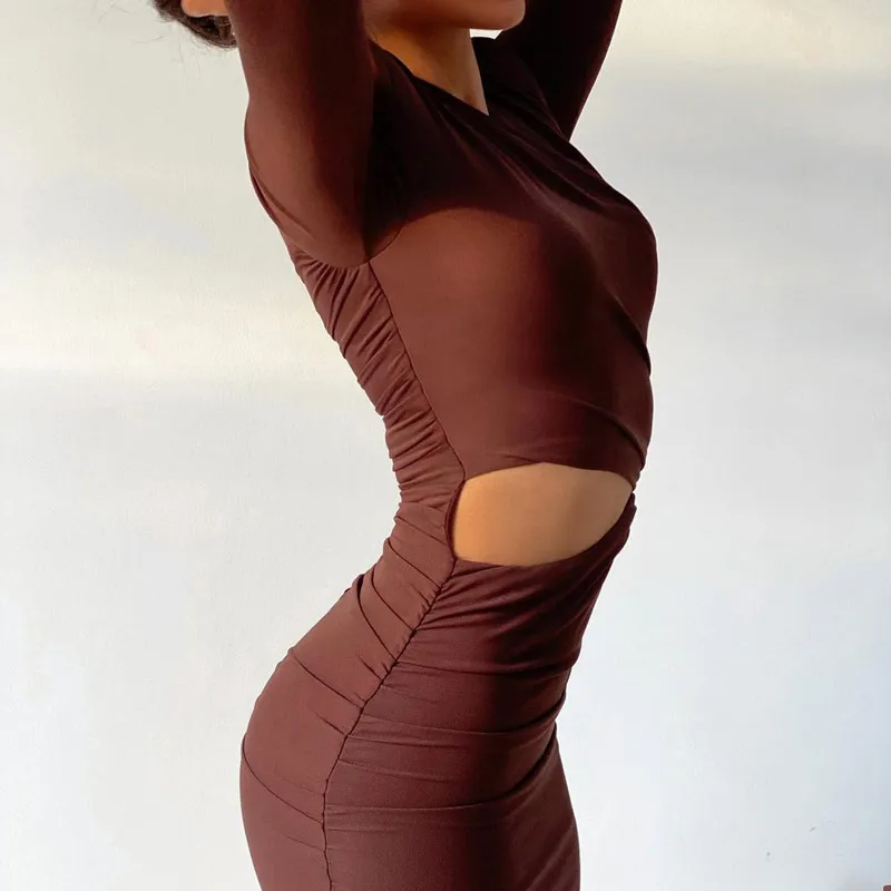 Осенне-зимнее Сексуальное Женское облегающее платье с вырезами из 2021 хлопка, коричневое элегантное женское платье с круглым вырезом и длин...