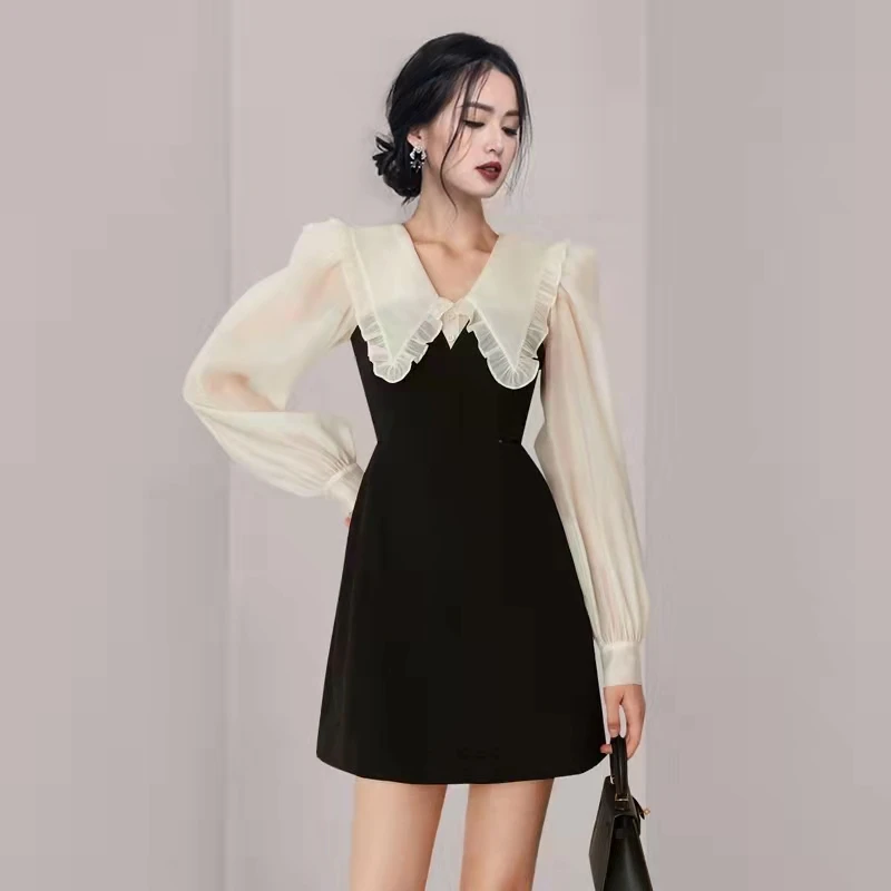 Осенне-зимнее корейское мини-платье, женское платье с круглым воротником и оборками для вечерние, элегантное привлекательное офисное плать...
