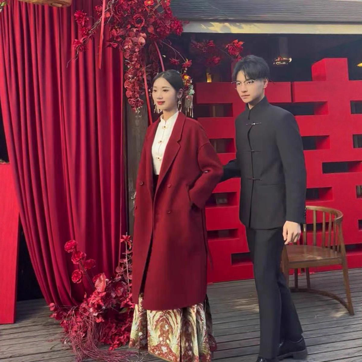 Осенне-зимнее красное шерстяное пальто: Свадебное и помолвочное платье в китайском стиле M