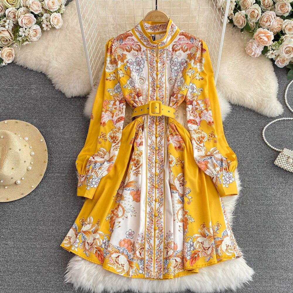 Осенне-зимнее однобортное платье в стиле ретро с принтом и длинными рукавами в стиле ретро на талии