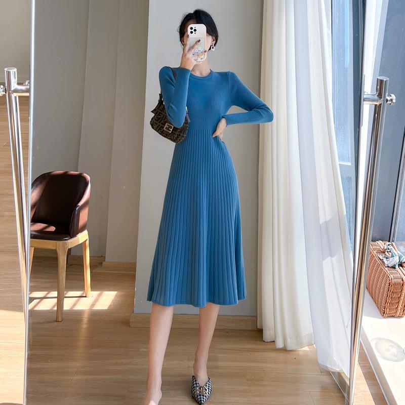 Осенне-зимнее шерстяное пальто и облегающее трикотажное платье средней длины Medium синий