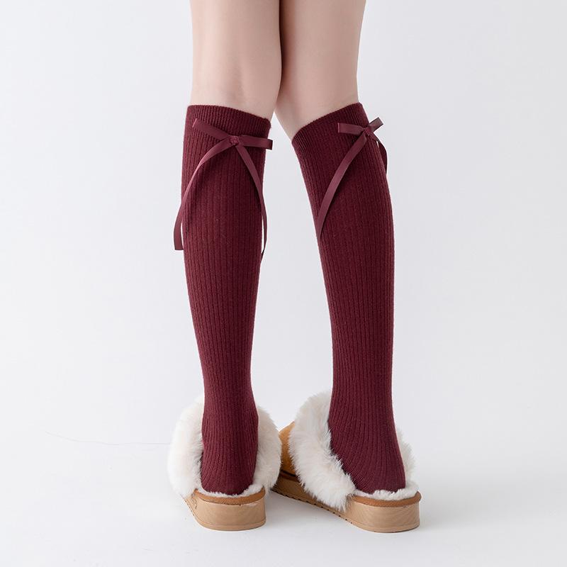 Осенне-зимние кашемировые носки до икр, женские с лентами-бантами, теплые утолщенные до колена, для стройности в сочетании с ботинками, универсальные чулки до бедра 1 pair бордовый