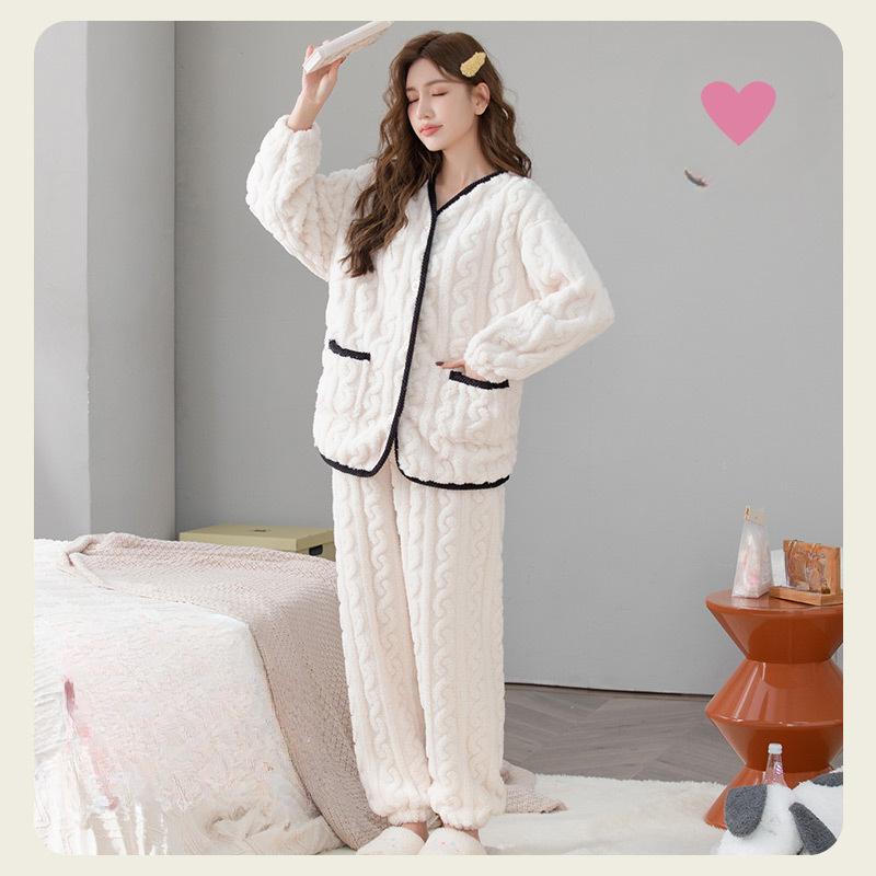 Осенне-зимний коралловый бархатный пижамный комплект с 3D жаккардовым фланелевым кардиганом с длинными рукавами Домашняя одежда