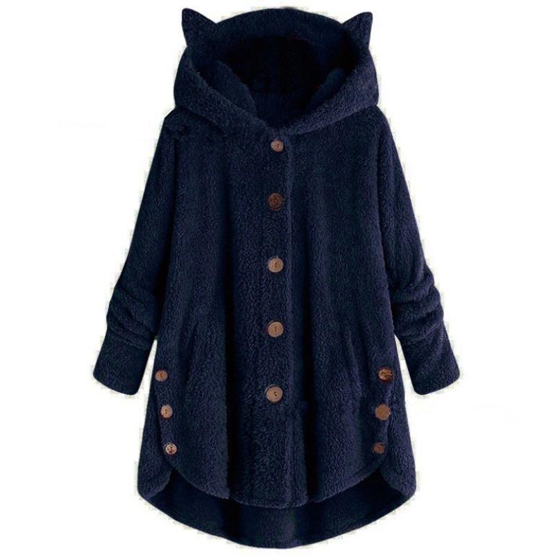 Осенне-зимний пуговица с капюшоном «кошачьи уши» (Хлеб в форме кошачьих ушей, приготовленный на пару) Пальто с плюшевым верхом, нерегулярное, однотонное, женское 2XL тёмно-синий
