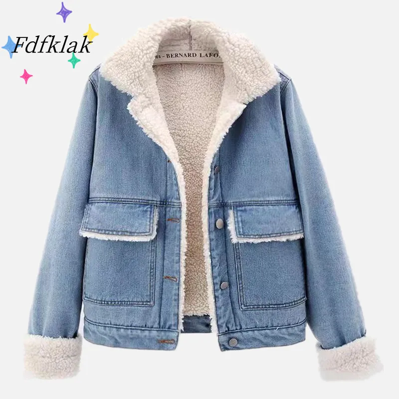 Осенне-зимняя Универсальная джинсовая куртка Fdfklak из овечьей шерсти, Женская бархатная Толстая Свободная куртка в Корейском стиле для студ...