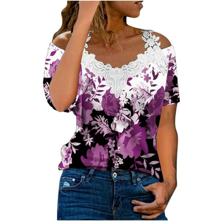 Yourumao Women Clearance Tops Floral Print Slim Tunic Camisole for Teen Girls Fall Summer Short Sleeve Off Floral Shoulder Tops Bustier Women 2023 Clothes Fashion