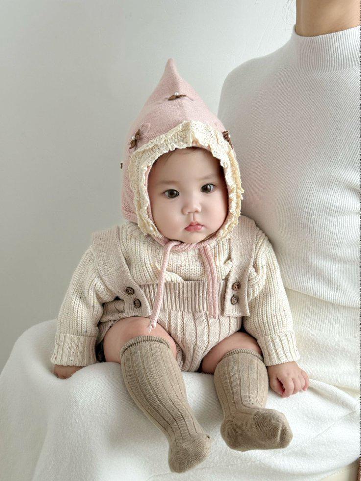 Осенне-зимняя детская шапка-принцесса с кружевом и бантом: Вязаная шерстяная шапка, согревающая уши S розовый