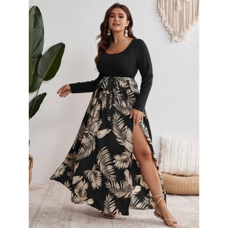 Осенне-зимняя женская мода с цветочным принтом и круглым вырезом на талии Платье больших размеров 4XL чёрный