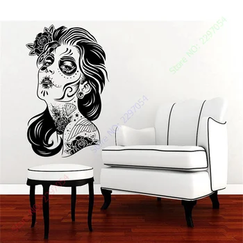 Happy Halloween Skull Girl Face Hair Tattoo Salon Zombie Fashion Vinyl Carving Wall Decal Sticker for Holiday party Home Decor
