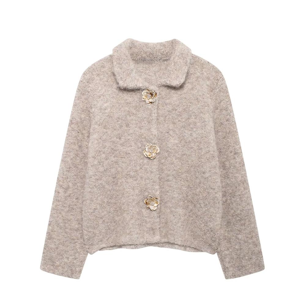Осенне-зимняя женская трикотажная куртка с длинными рукавами и лацканами в форме цветка, декорированная пуговицами, мягкая и удобная M хаки