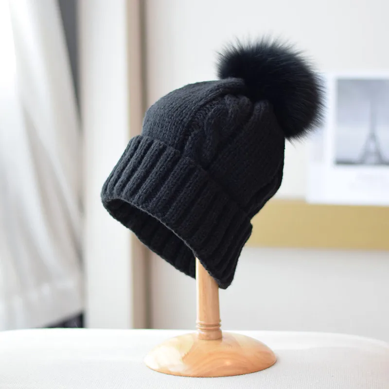 Осенне-зимняя кашемировая шапка с большой окружностью головы, Женская плотная шерстяная шапка с помпоном из лисьего меха, теплые вязаные ша...