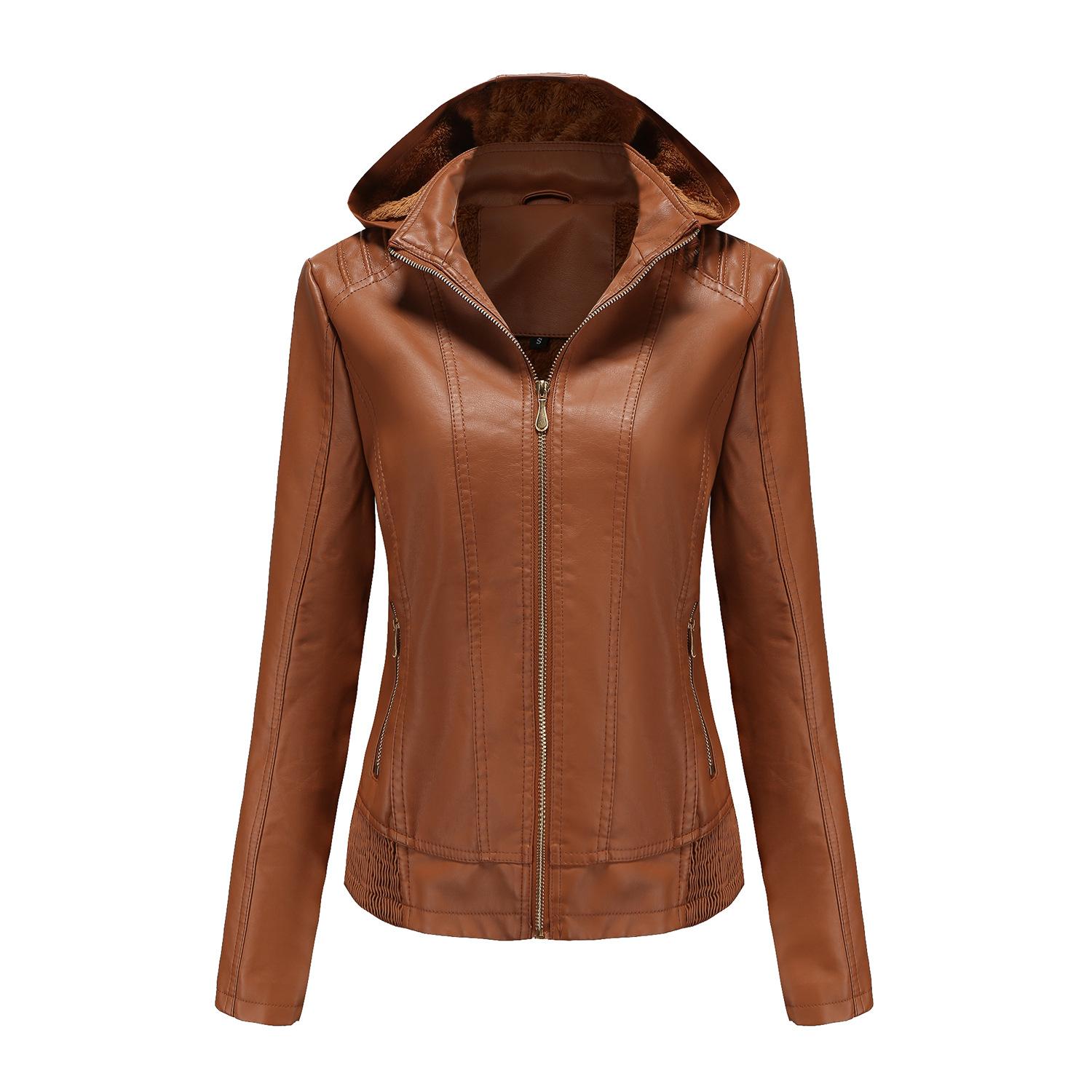 Осенне-зимняя куртка из кожи с капюшоном для женщин со съемным капюшоном плюс бархатная кожаная куртка приталенная куртка 3XL темно-коричневого