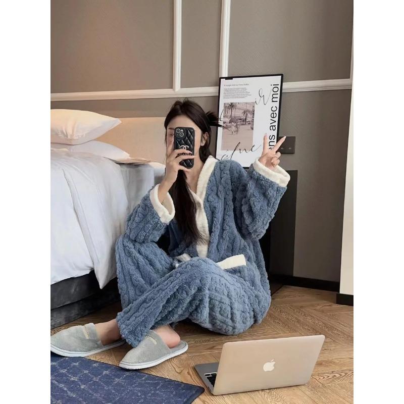 Осенне-зимняя пижама, утепленная верхняя одежда, свободная, корейский стиль, студенческий, коралловый бархат, рождественский подарок на день рождения L синий