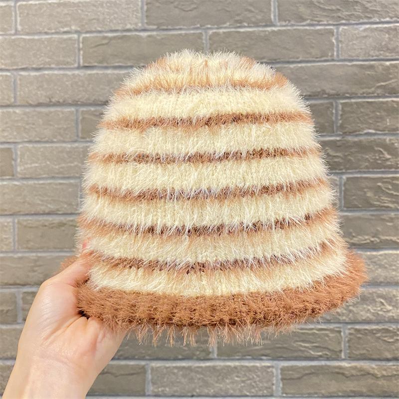 Осенне-зимняя плюшевая полосатая панама женская для маленького лица вязаная шерстяная шапка с защитой ушей теплая универсальная шляпа-ведро Adult (55-58cm) хаки