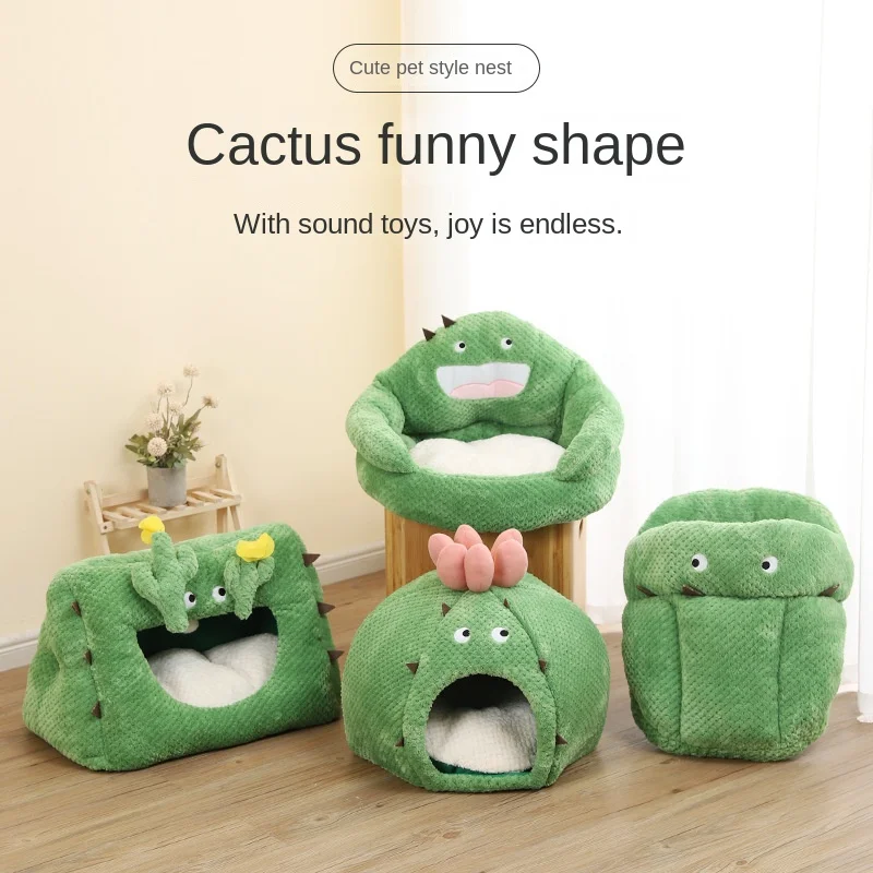 Осенне-зимняя теплая кровать для кошек с зеленым КАКТУСОМ, полностью закрытый домик для кошек, веселая палатка для кошек, кровать для малень...