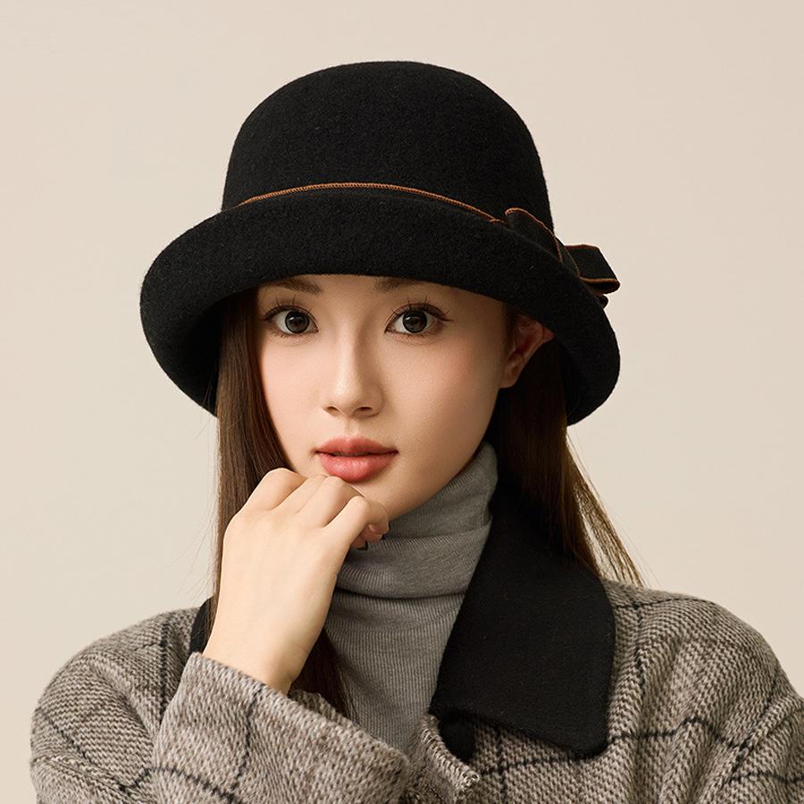 Осенне-зимняя шерстяная шляпа-рыбак с поясом, женская шерстяная шляпа-тазик чёрный