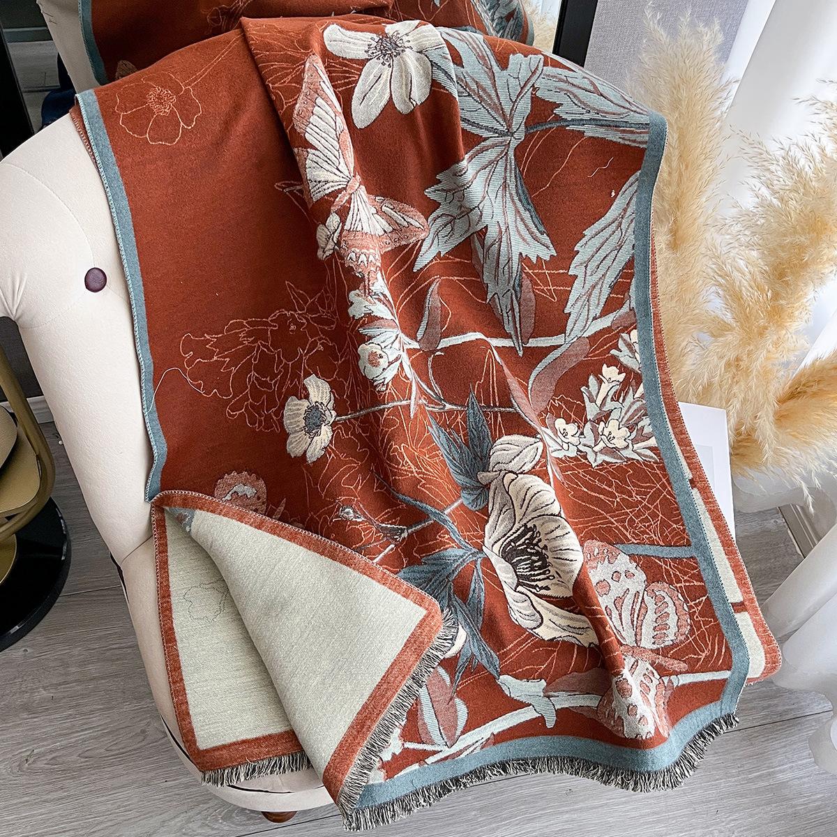 Осенние растения и цветы Имитация кашемира Жаккардовый шарф Женский простой и универсальный Утолщенный теплый шарф Шаль 185x65cm темно-коричневого
