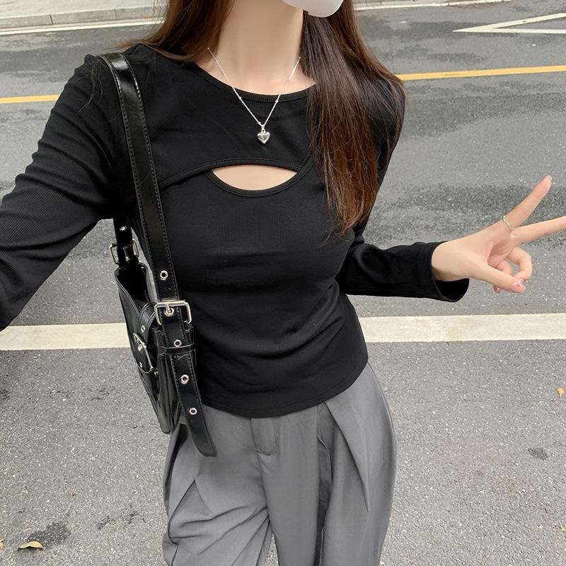 Осенний новый стиль сращивания полых сексуальных чистое желание футболка с длинными рукавами женская облегающая талия круглый вырез правое плечо верхняя часть нижняя рубашка M