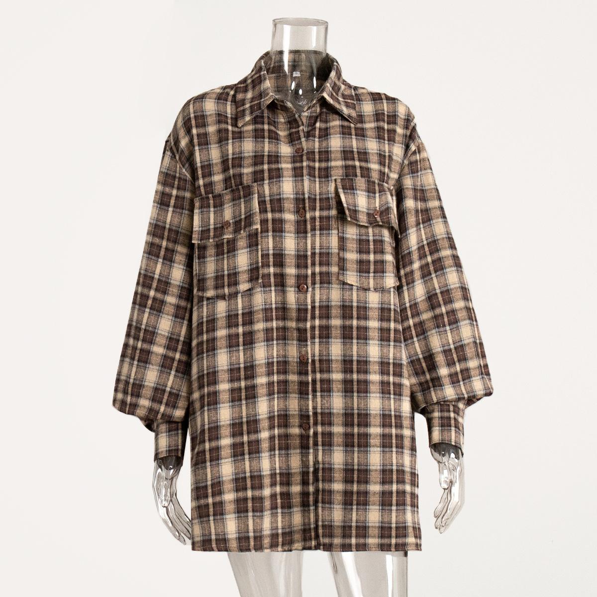 Осенняя женская свободная рубашка в стиле ретро с узором поло и воротником, нижняя часть рубашки в клетку L кофейный