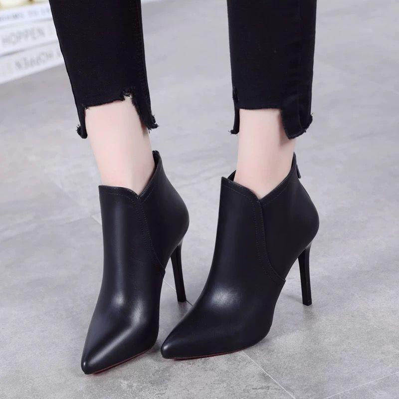 Осенняя и зимняя обувь. Женские сапоги на высоком каблуке большого размера и тонком каблуке удобны с острыми носками и молниями сзади. 35 чёрный