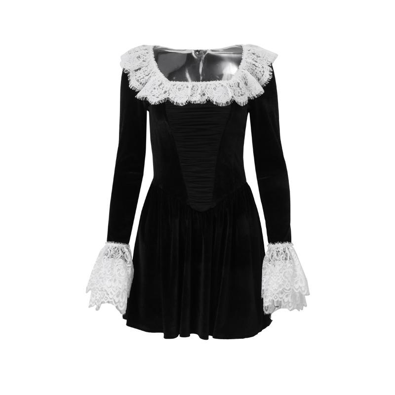 Осенняя мода сексуальное темпераментное французское кружевное платье из бархата с длинными рукавами L чёрный