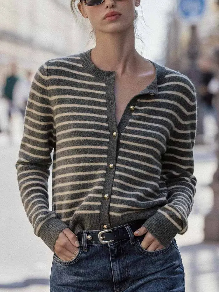 Осенняя новая модная простая женская универсальная полосатая вязаная куртка в европейском и американском стиле с длинными рукавами для поездок на работу