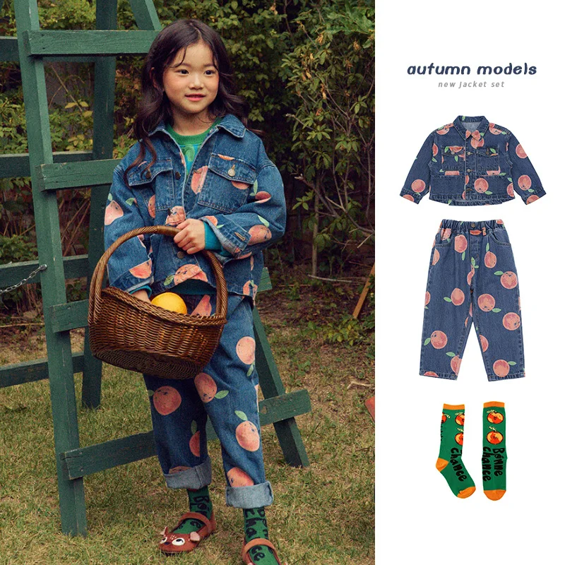 Осенняя оранжевая джинсовая куртка с принтом для мальчиков и девочек, пальто, прямые брюки, новинка 2022, нишевые Повседневные детские джинсы ...