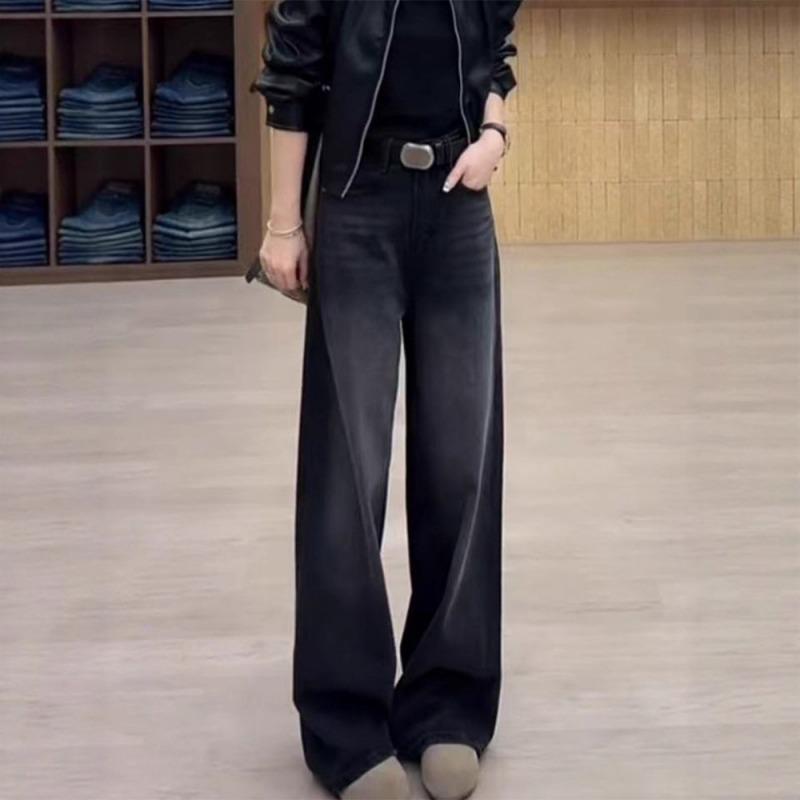 Осень Зима Брюки Деним с Высокой Посадкой Винтажные Широкие Женские Свободные Повседневные Подходящие ко всему Прямые Джинсы Брюки S черный серый