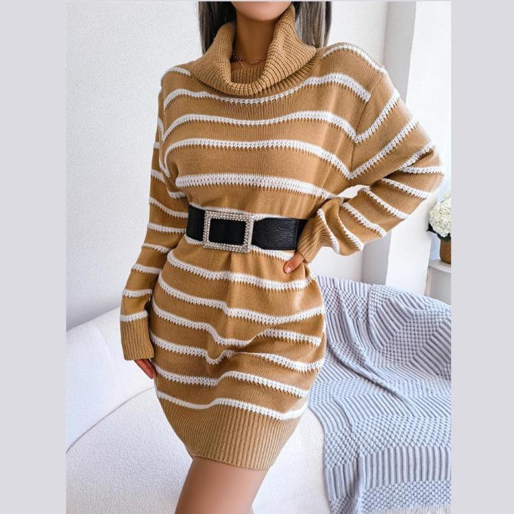 Осень Зима Женское Свободное Вязаное Платье Водолазка В Полоску Длинный Рукав Свитер Размеры от S до L L