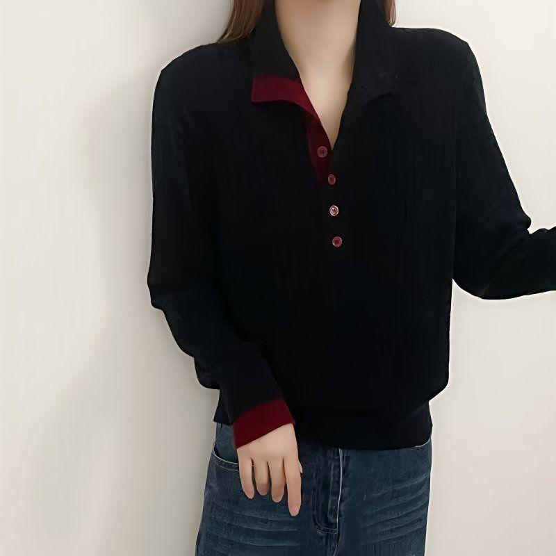 Осень Зима Новый Вертикальный В рубчик Топ Повседневный Цветной блок Воротник-стойка Половина Открытый Вязаный Топ S чёрный