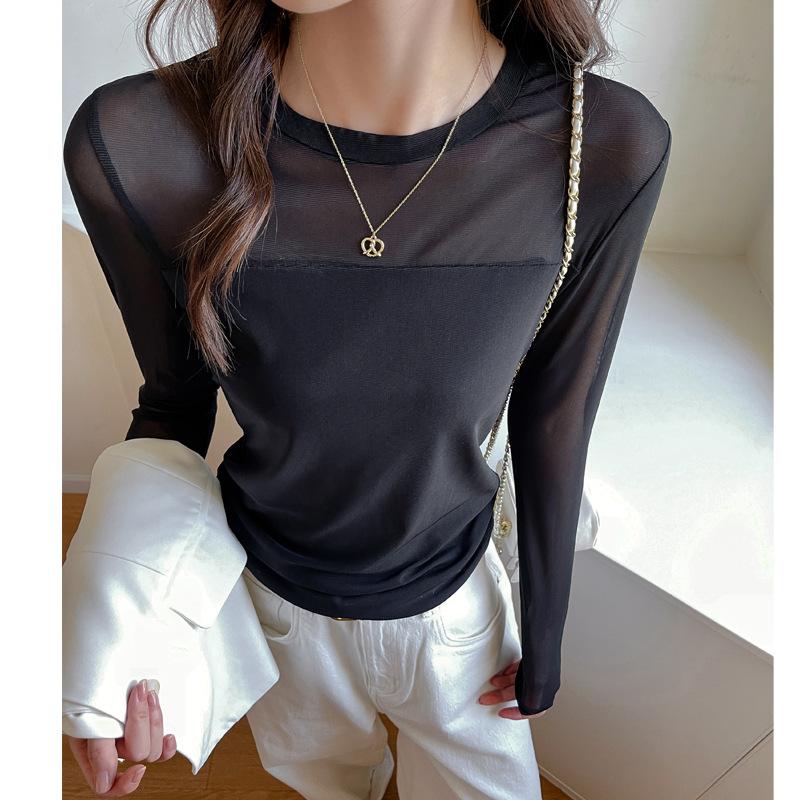 Осень Зима Однотонная Сетчатая Лоскутная Футболка Женская Круглый Вырез Длинный Рукав Повседневная Модная Базовая Футболка Топ S чёрный