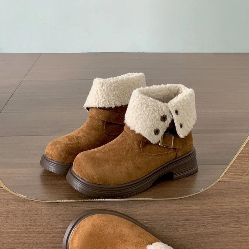 Осень Зима Теплые Хлопковые Женские Ботильоны Модные С Пряжкой На Ремне Низкий Каблук Обувь Женская Винтажные Короткие Плюшевые Короткие Ботильоны 40 верблюд