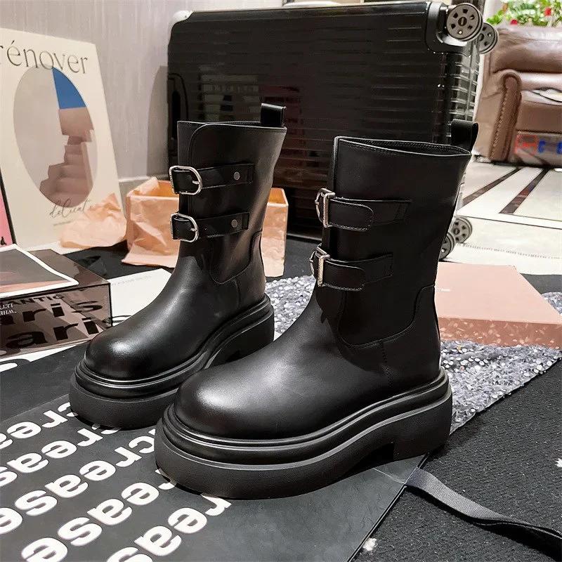 Осень Зима Толстый Каблук Женские Сапоги до Середины Икры Новые Готические Сапоги для Икр Мотоциклетные Сапоги Мода Передняя Пряжка Удобные Сапоги для Ходьбы 35