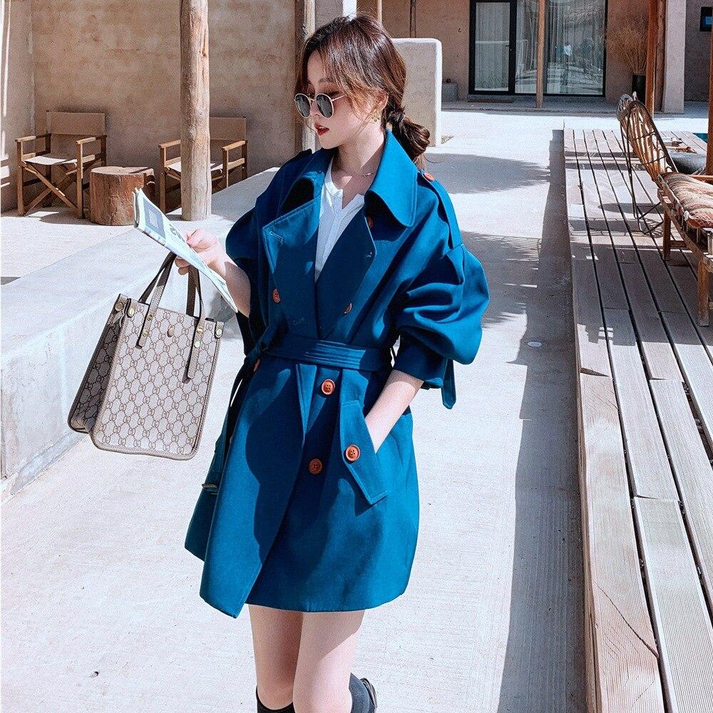 Осень Оверсайз талия-тугой Короткий Стиль Тренч отстающей воротник Пояс Двубортный Высокий Талия Пальто Женщины Верхняя одежда