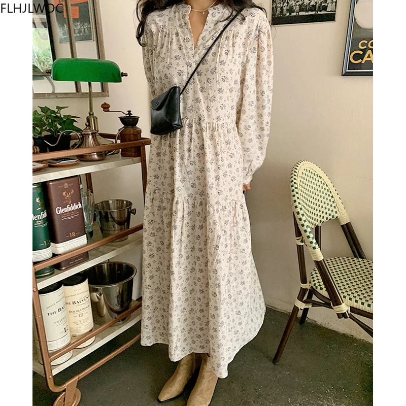 Осень-весна, женское повседневное Свободное длинное винтажное платье макси в стиле преппи, с цветочным принтом для девочек, модель размера ...