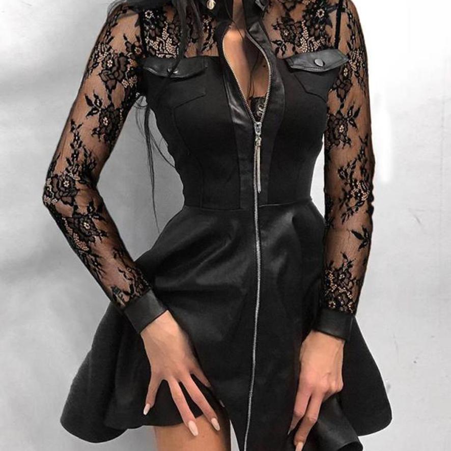 Осень и зима Женская мода Сексуальная тонкая сетка с длинными рукавами V-образным вырезом Молния PU Карманное платье