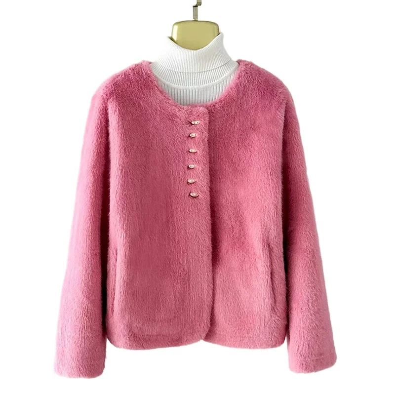 Осень-зима Новые женские норковые пальто Корейская мода Шикарные молодежные однотонные толстые кардиганы с круглым вырезом Короткие меховые куртки Плюшевая верхняя одежда Топы