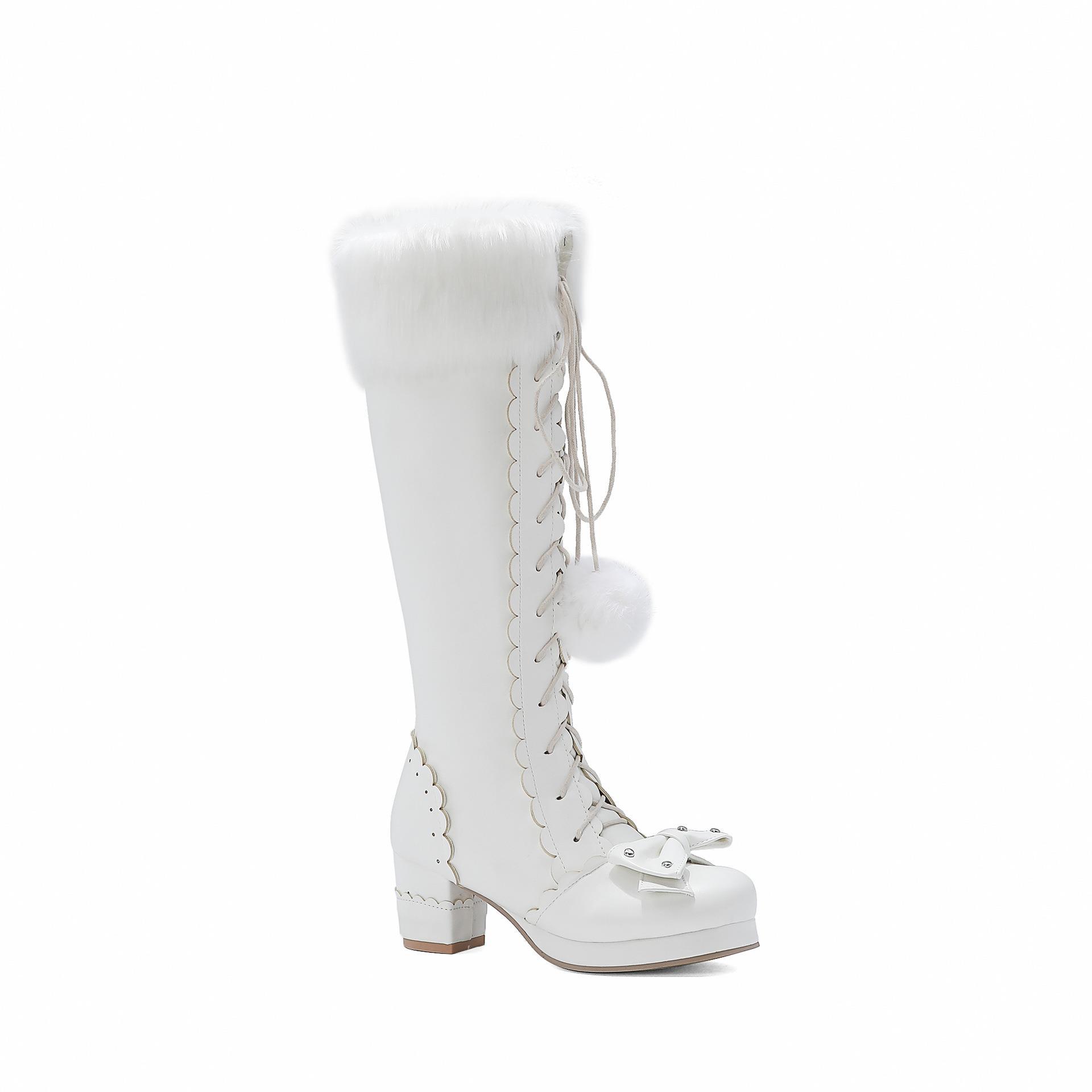 Осень-зима Новые модные женские сапоги до колена с бантом на толстом каблуке Теплые длинные сапоги Водонепроницаемая платформа Женская свадебная обувь в стиле Лолиты 37