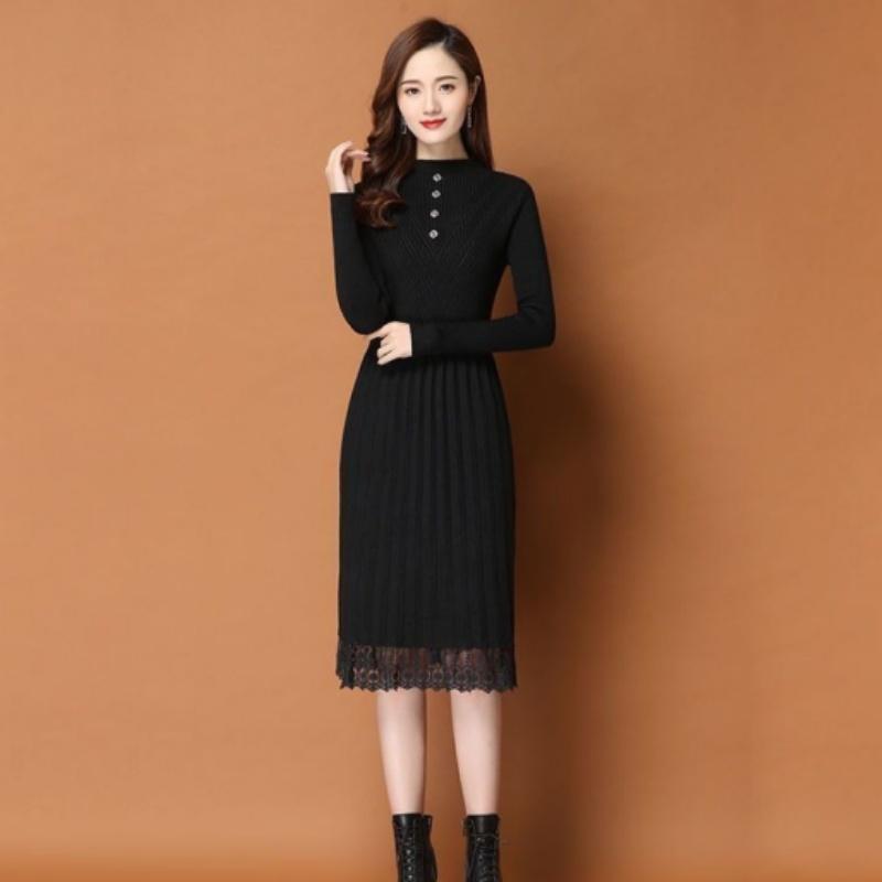 Осень-зима Утолщенное трикотажное платье Женское трикотажное платье с длинными рукавами, длинное выше колена, кружевное платье Милое платье А-силуэта S