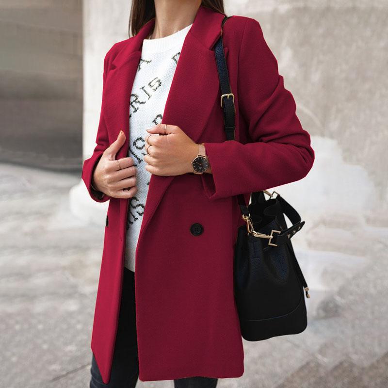 Осень-зима длинные шерстяные пальто сплошной цвет костюмный воротник двубортное женское шерстяное пальто с длинным рукавом