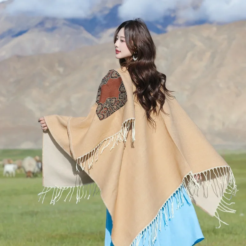 Осень-зима, женская шаль в этническом стиле, пальто с карманом в пустыне, универсальный теплый шарф с кисточками, дорожная накидка на плечо, модный аксессуар