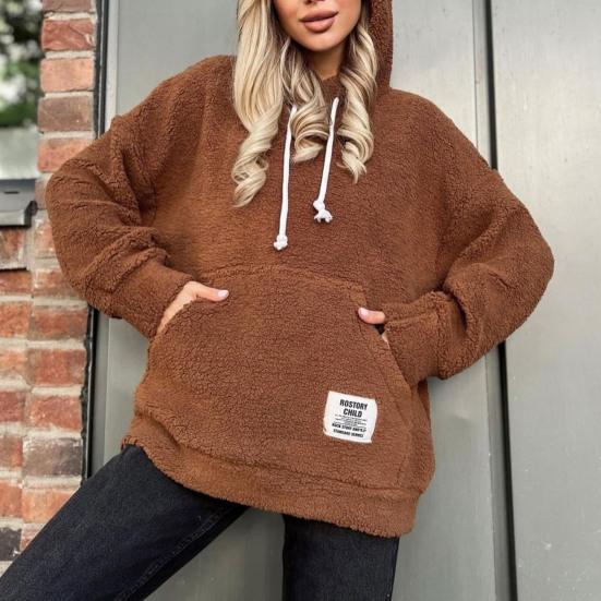 Осень-зима женские толстовки с большим карманом и длинными рукавами пуловер плюшевые топы модные однотонные пальто с капюшоном на шнурке повседневная женская толстовка