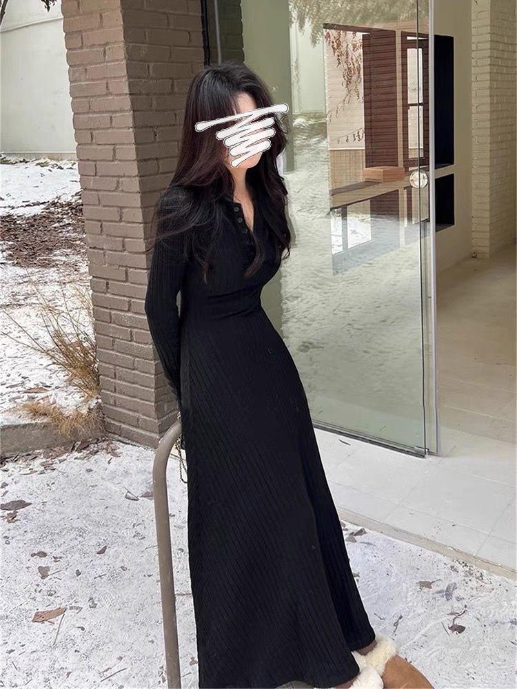 Осень-зима, корейский стиль, темперамент, облегающие, с V-образным вырезом, трикотажные платья для женщин, однотонные, универсальные, модные, повседневные, простые, Y2k M чёрный