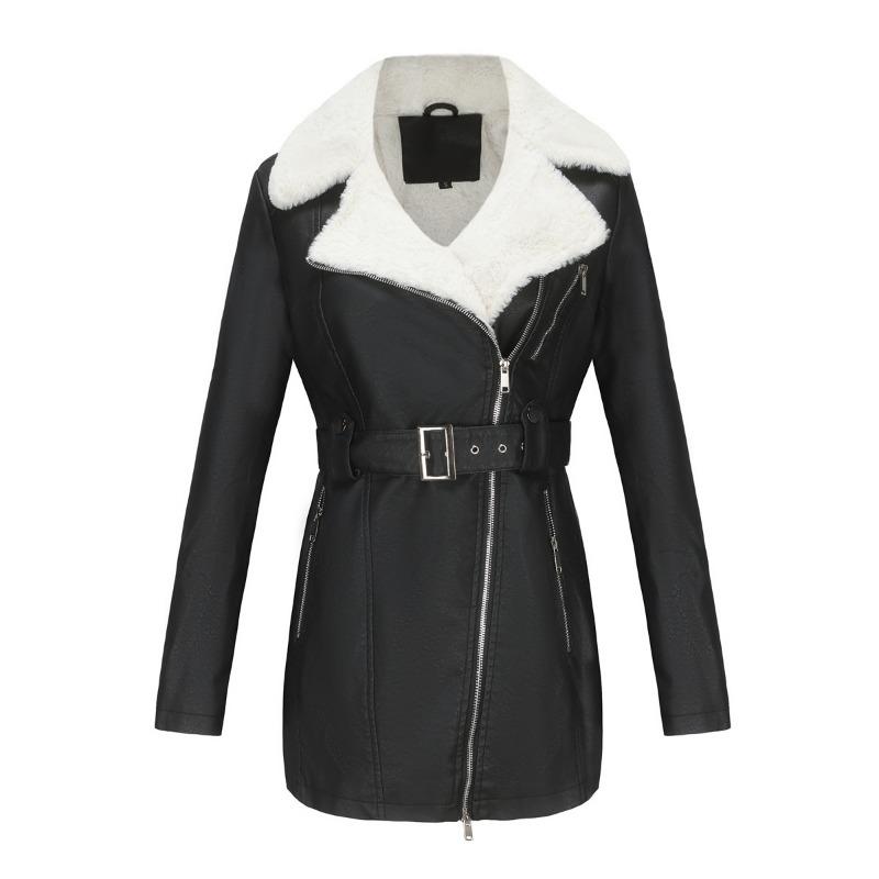 Осень и зима новая вельветовая кожаная куртка с длинным рукавом женская с лацканами двухсторонняя молния пояс пояс теплая куртка S чёрный