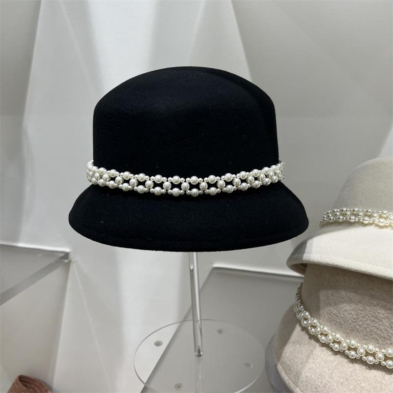 Осень и зима новая шерстяная фетровая роскошная стильная шляпа-ведро модная фетровая шляпа с жемчугом ретро шляпа-котелок M(56-58cm) чёрный