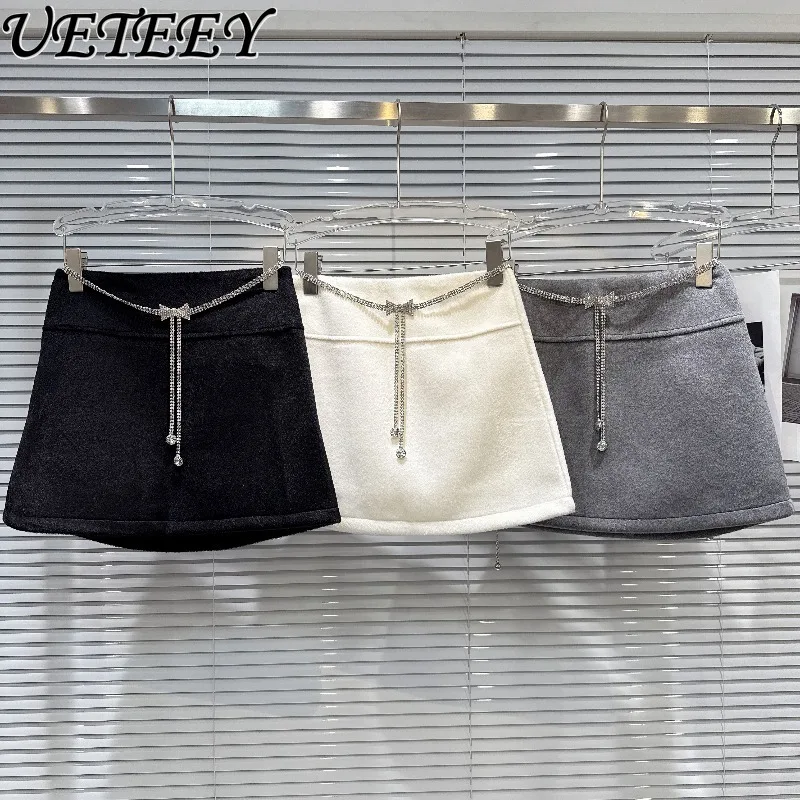 Осень-зима, новая элегантная светская львица, стразы, бант, высокая талия, цепочка, шерстяная короткая юбка, однотонные универсальные мини-юбки трапециевидной формы