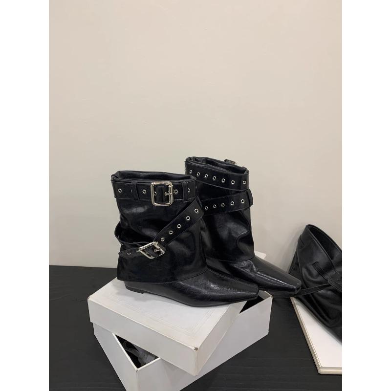 Осень и зима новые остроносые ботинки в западном стиле с заклепками женские ботильоны до колена ботильоны с ремешком и пряжкой толстый каблук тонкие ботинки 39 чёрный